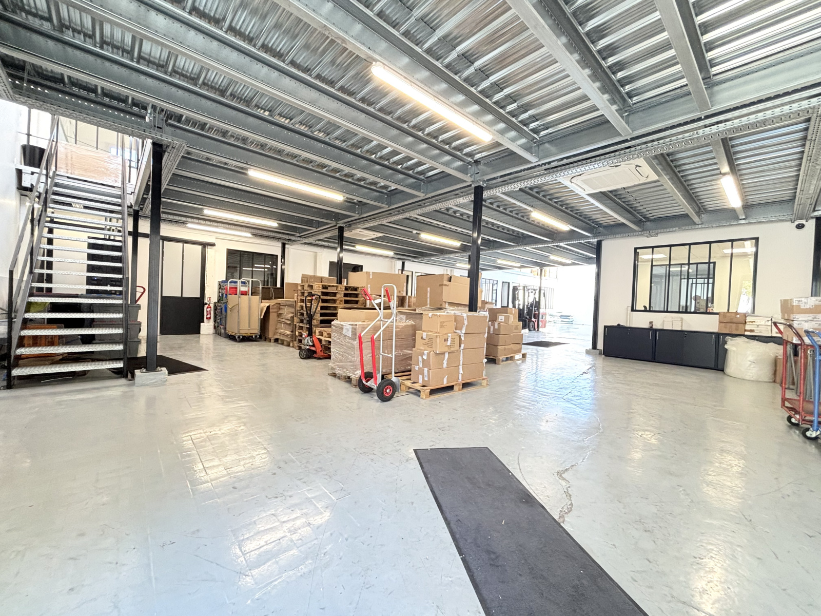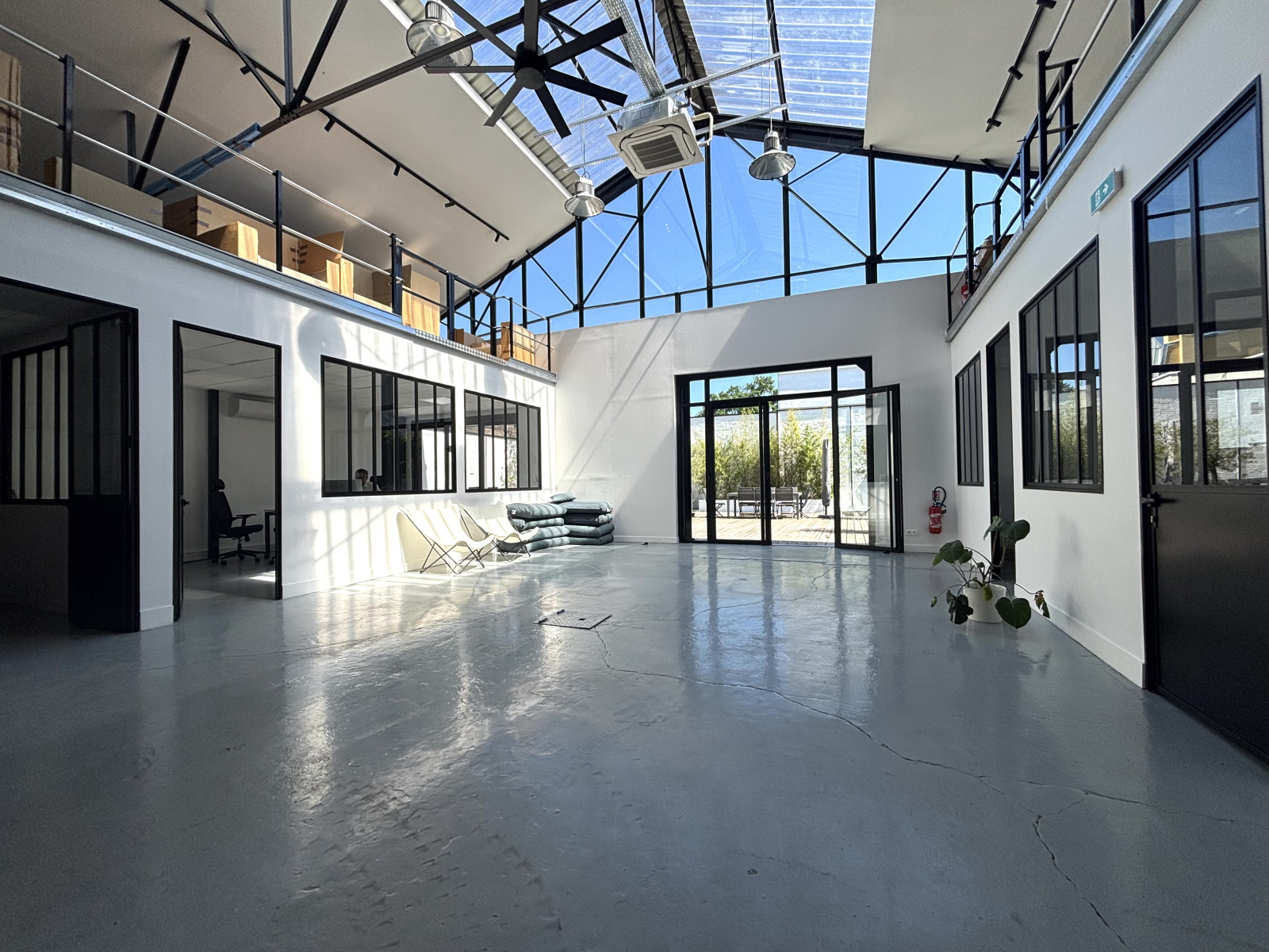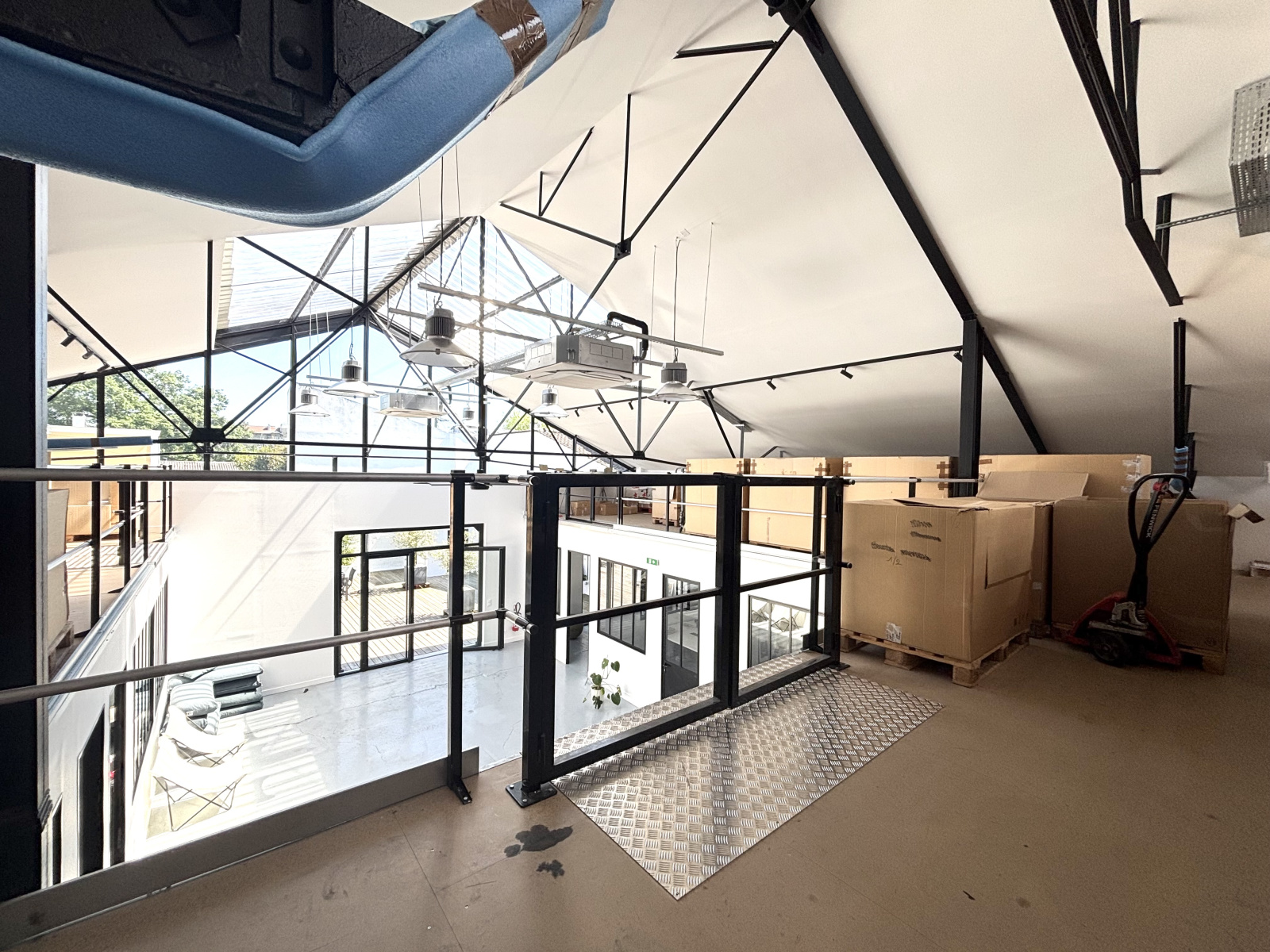 À l’étage, une salle de réunion vitrée, un bureau vitré cloisonné, une cuisine équipée avec mobilier intégré, lave-vaisselle, réfrigérateur et micro-ondes, ainsi qu’une grande mezzanine ouverte d’environ 250 m² complètent l’ensemble.