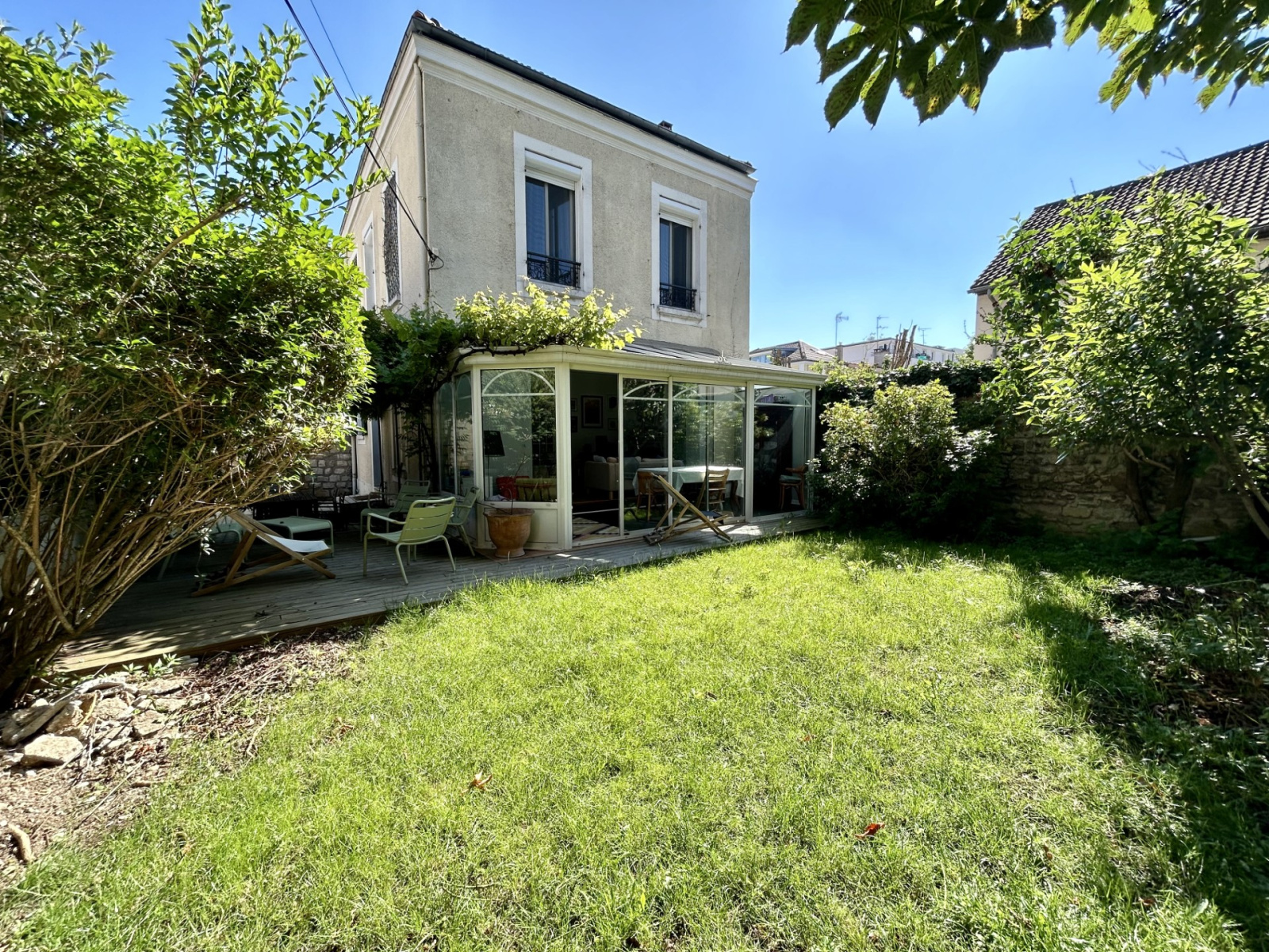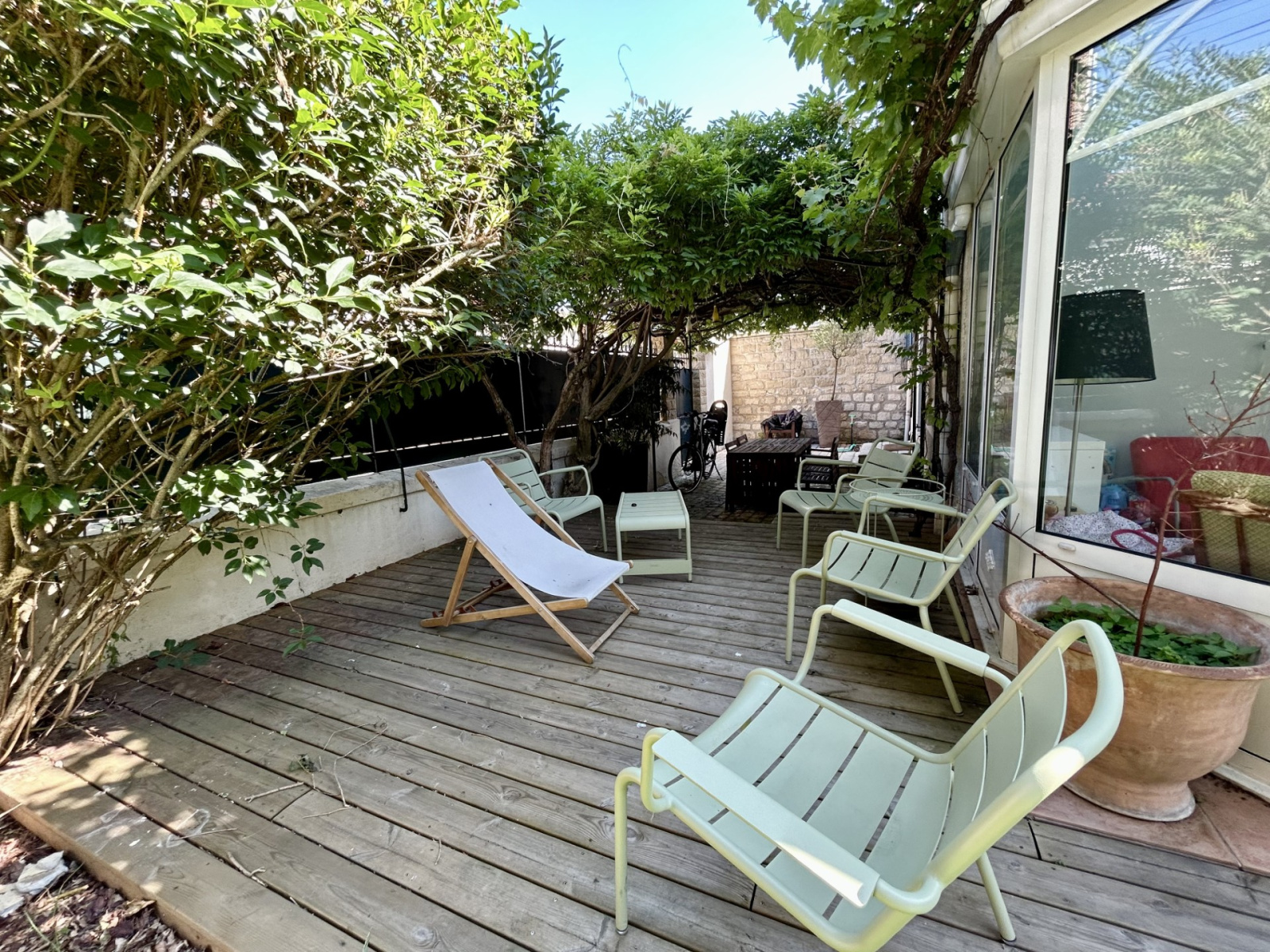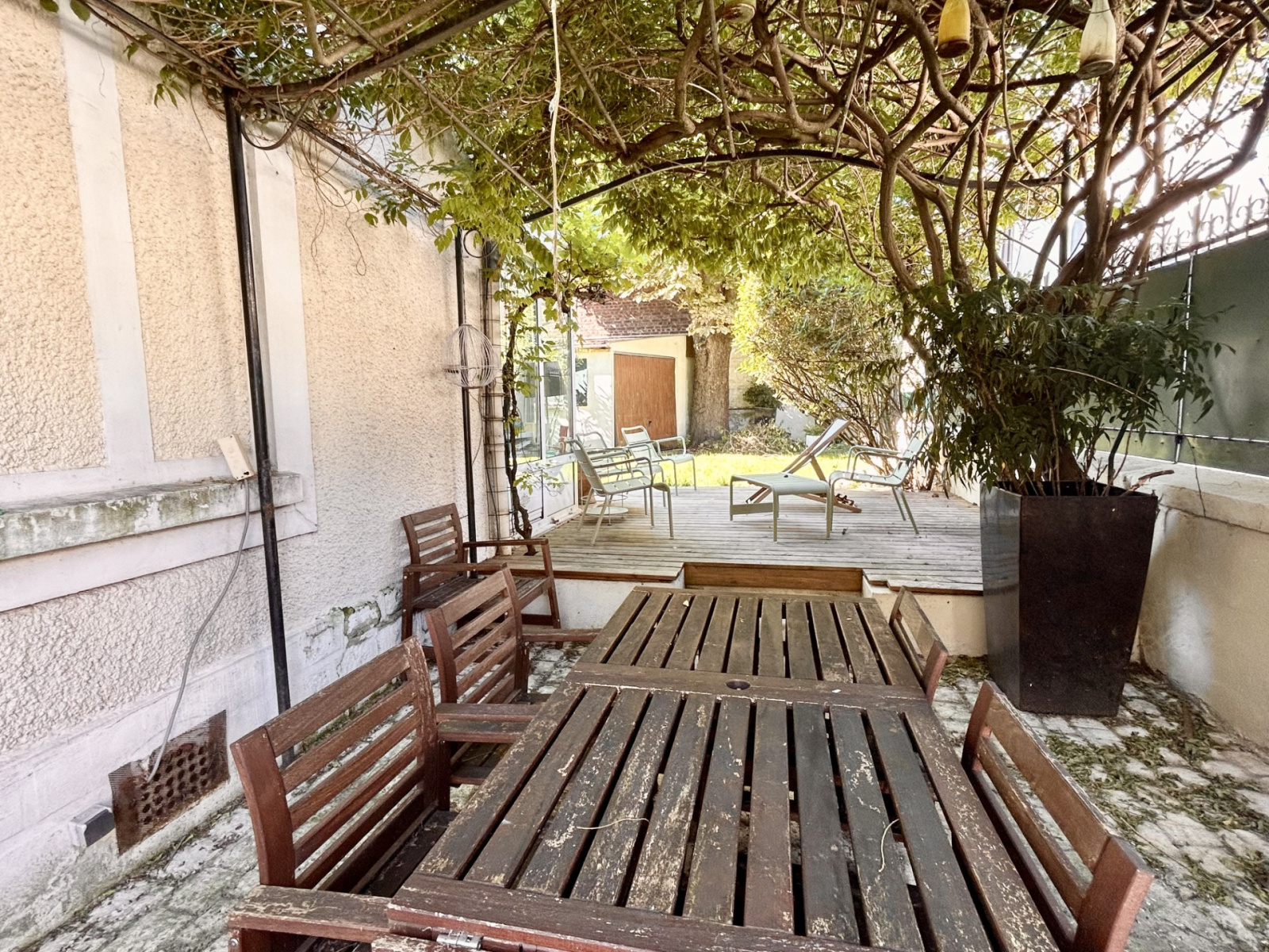 Le jardin, totalement au calme et parfaitement exposé et une belle terrasse pavée protégée par une jolie pergola en fer fleurie offrent un superbe espace de détente .
