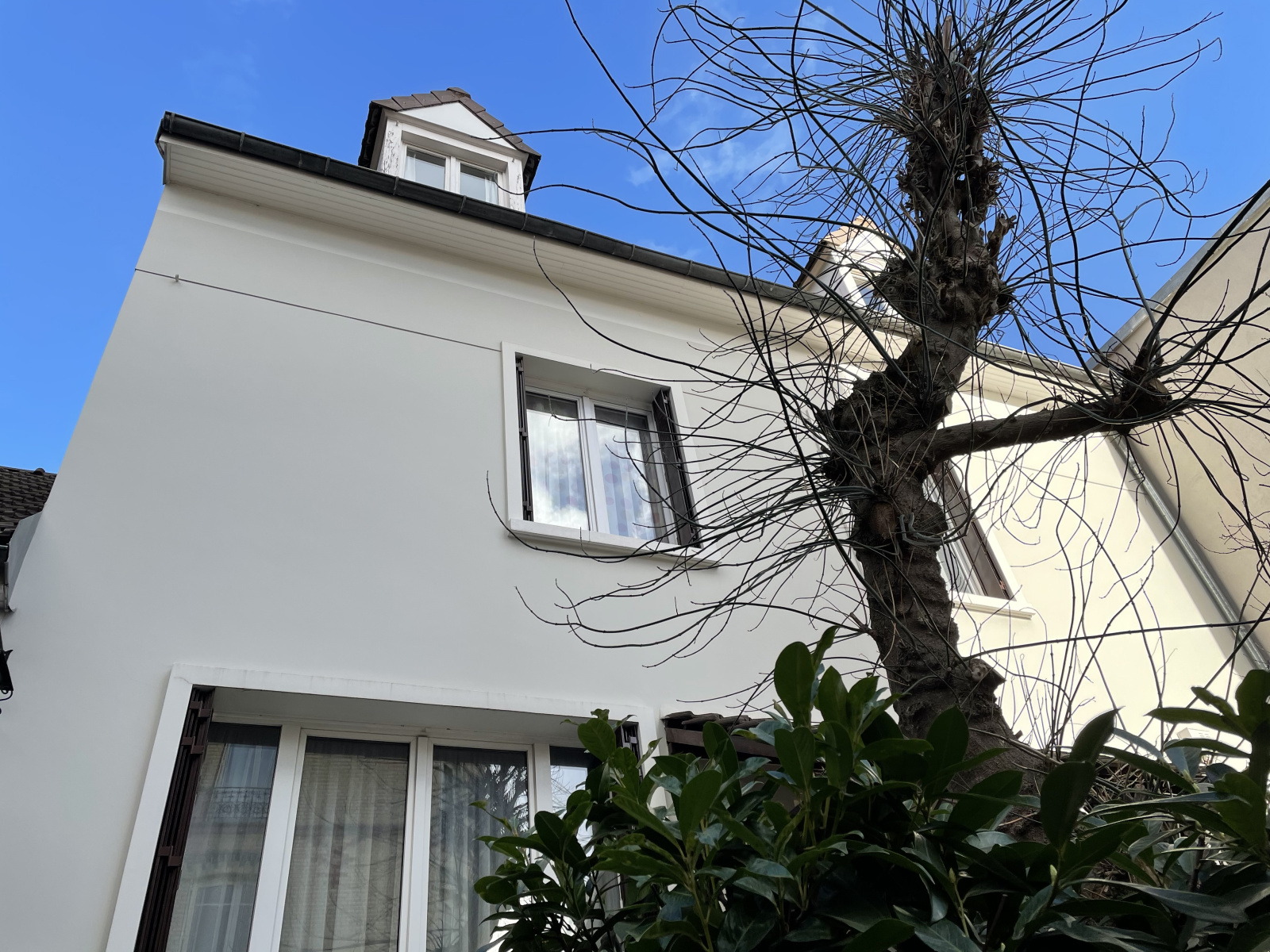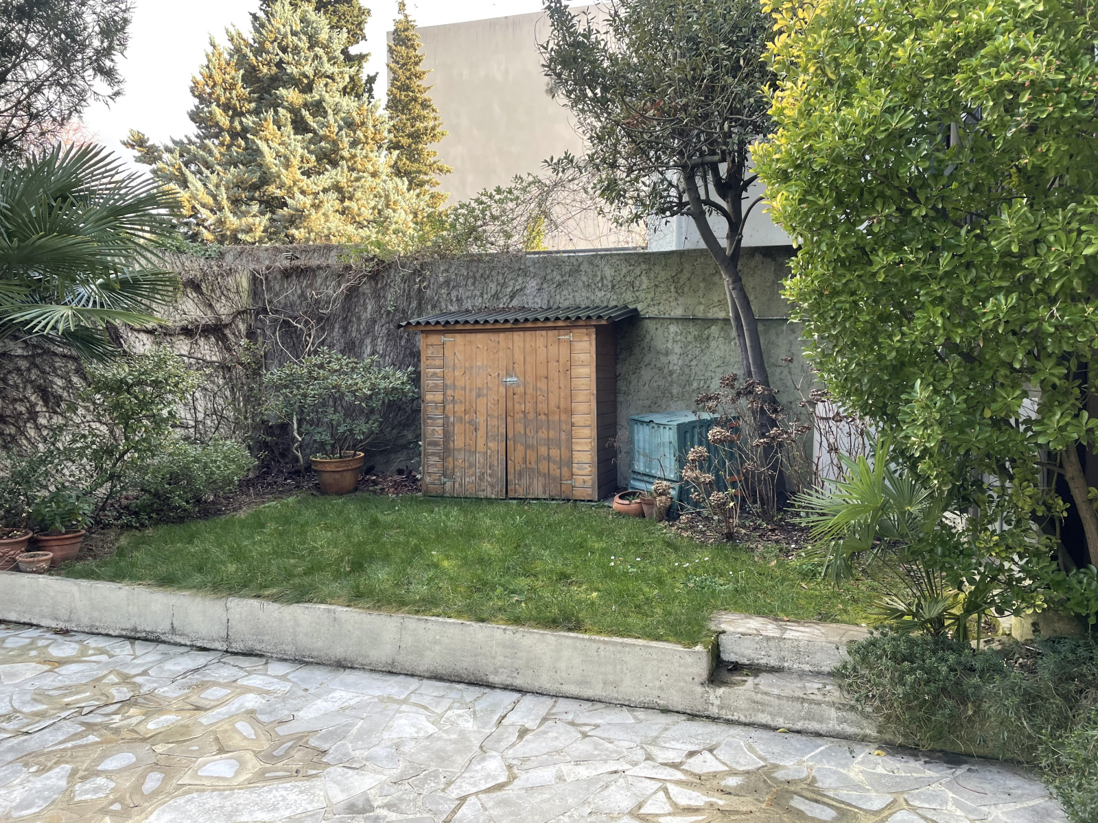 Jardin à l'abri des regards avec une partie terrasse et du gazon. Un énorme garage pour 2 voitures et une place de parking extérieur.