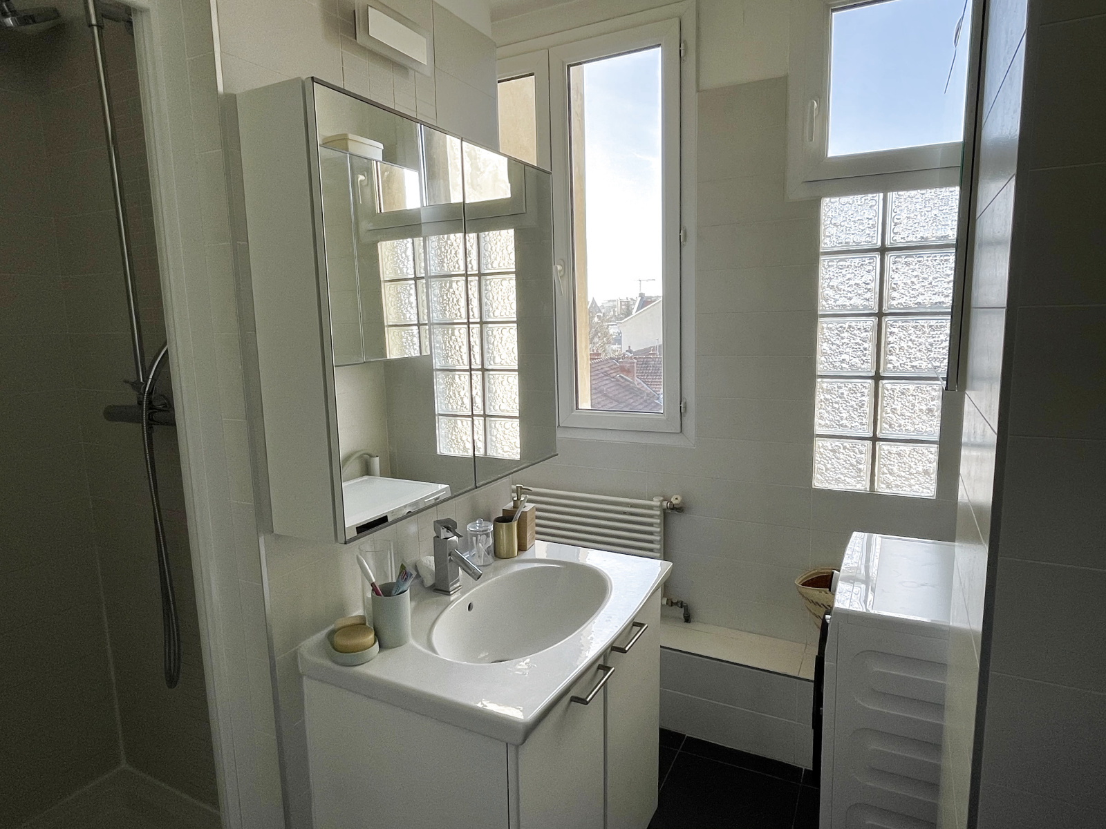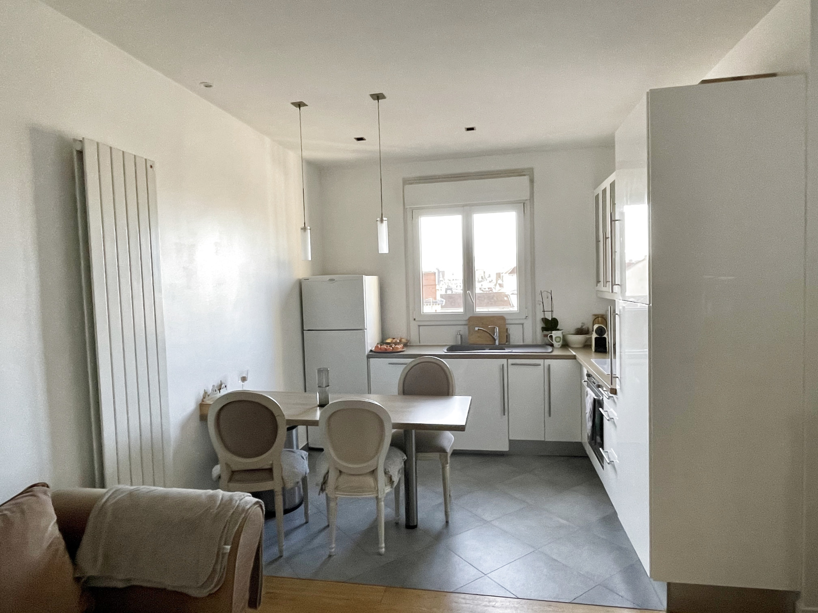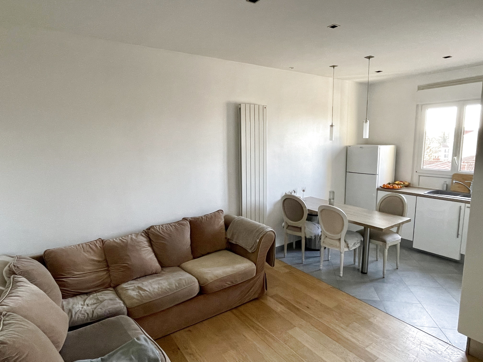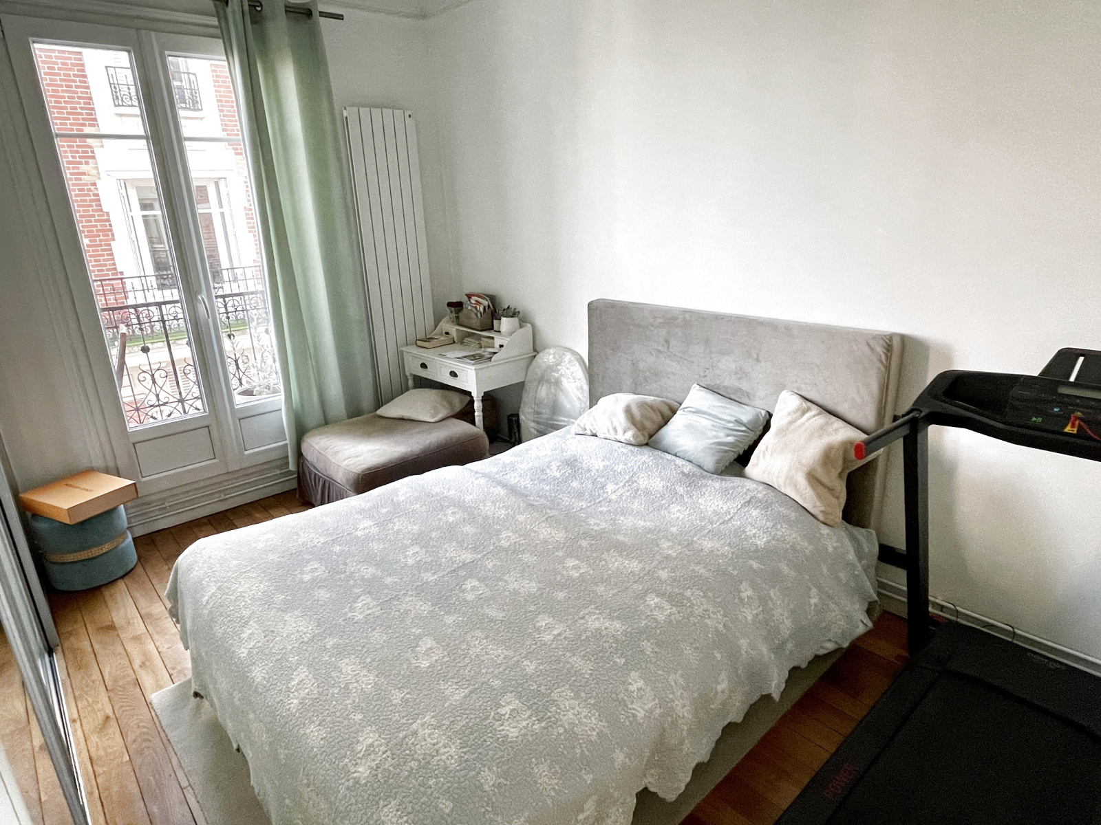 BOIS-COLOMBES MAIRIE : Au quatrième étage d'un très bel immeuble ancien à deux pas de la mairie, charmant appartement traversant de trois pièces principales entièrement refait à neuf. Entrée, séjour avec cuisine américaine équipée, deux belles chambres dont une avec dressing, salle d 'eau avec wc. Une cave et un chambre de service complètent ce bien.