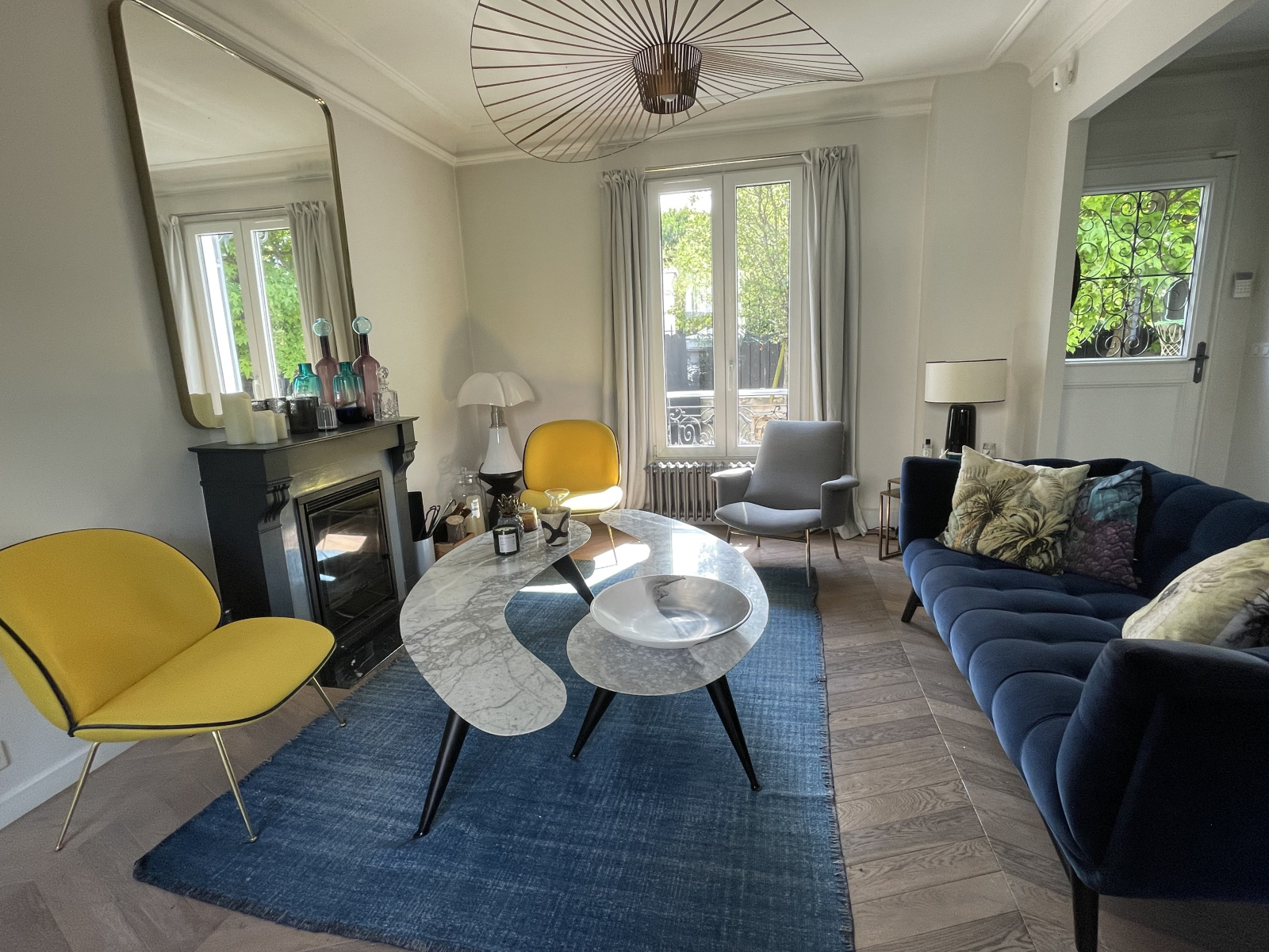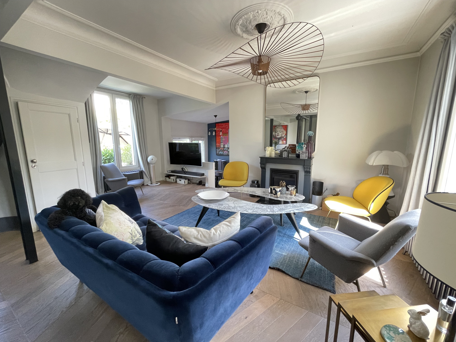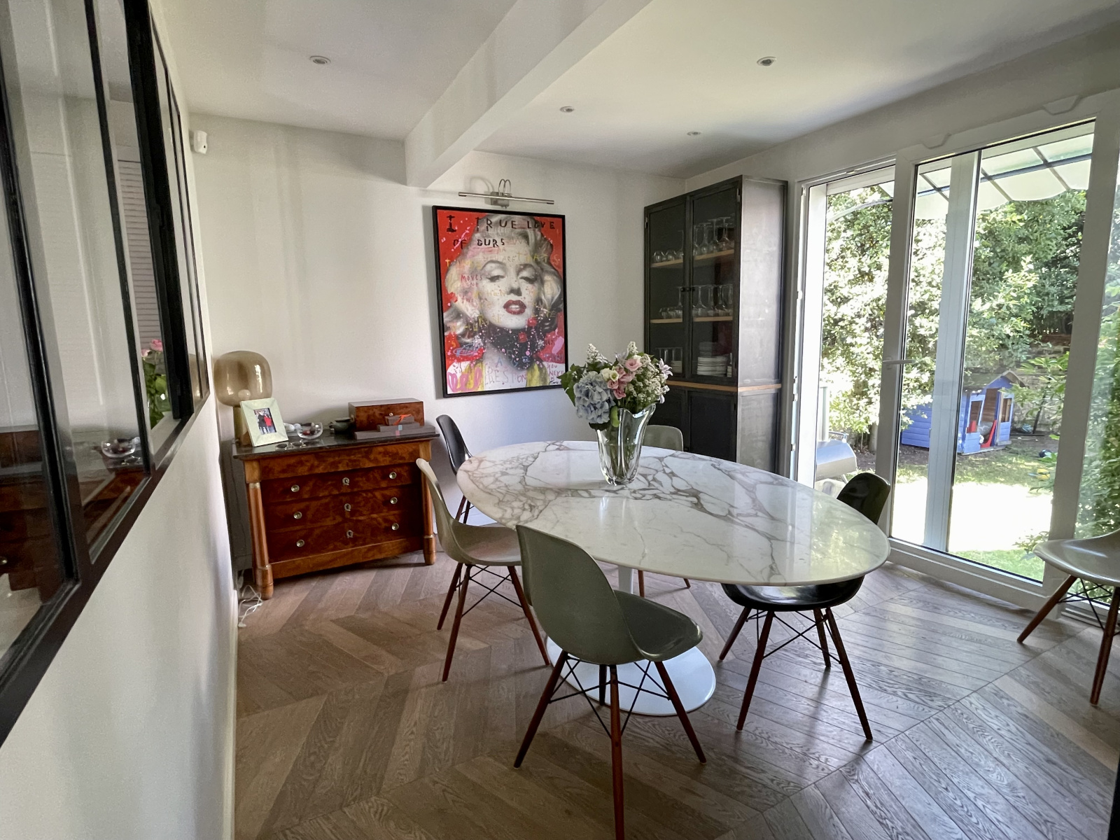 L'entrée ouvre sur un très bel espace de vie avec double séjour avec insert, salle à manger tournée vers le jardin séparée par une jolie verrière de la cuisine ultra équipée haute de gamme.