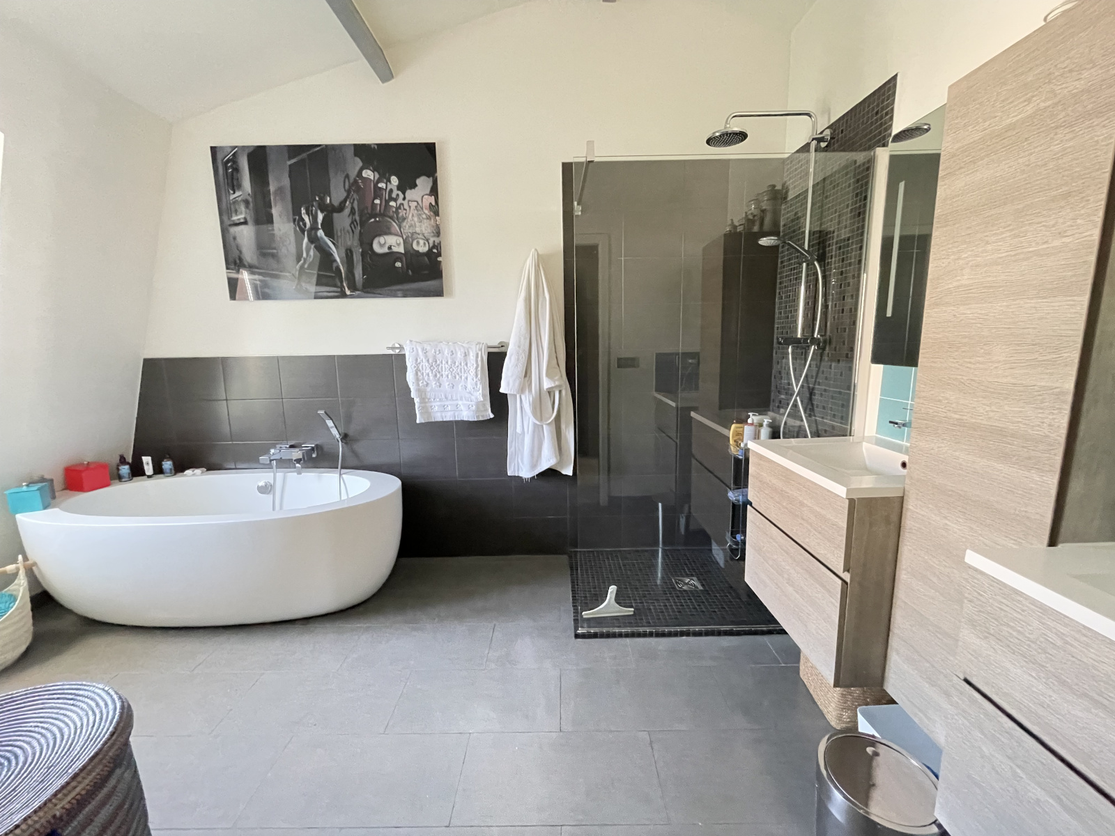 Au premier étage, 2 très grandes chambres, une salle de bains avec wc et au second étage, une chambre parentale avec vaste dressing, une salle de bains, douche et wc, et une 4 ème chambre.